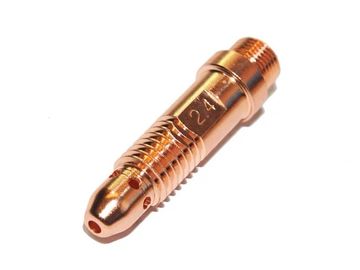MIG 焊槍用導電座,用於固定導電嘴並傳導焊接電流,確保焊接過程中電流穩定及送絲順暢。銅製結構,導電性能良好,屬焊槍常用配件之一。